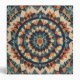 A vibrant geometric quilt pattern radiates from the center, creating an intricate mandala design with various colors, including teal green, rust brown, and beige shades.