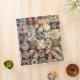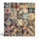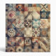 A colorful quilt with an assortment of patchwork patterns is displayed, each square featuring different designs and fabrics.