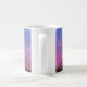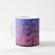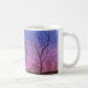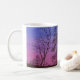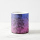 A watercolor painting of an old fence row and autumn trees silhouetted against the pinks and deepening blues of the evening, twilight sky adorns this mug.