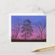 A watercolor painting of an old fence row and autumn trees silhouetted against the pinks and deepening blues of the evening, twilight sky adorns this postcard!