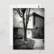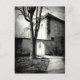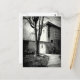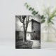 Postcard with black and white photography showing an old vine-covered house and garden in Montmarte, Paris. A leafless winter tree stands in the foreground, and a path leads to an arched gate in a wall.