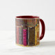 Old Leather-Bound Books Mug - Step into a world of classic literature and timeless knowledge with our Old Leather-Bound Books Mug. This unique mug features a beautifully crafted design of old leather-bound books, complete with ornate details, colorful faux embroidery texture and a vintage feel. The colorful and decorative pattern is reminiscent of a classic library or bookshelf, evoking a sense of nostalgia and love for reading. Shown with maroon handle and interior, but you can choose a different color if desired.