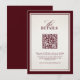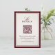 This elegant burgundy and ivory wedding details card features a minimalist layout with a rich maroon border and refined typography. The centered QR code allows guests to instantly access your wedding website for ceremony details, reception information, travel guidance, and accommodation updates.