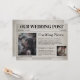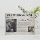 This unique save the date for the wedding invitation features an old newspaper theme. The background features a faded pattern that resembles a newspaper. The headline "exciting news" is printed above sample article about the proposal and date for the wedding. An image of the couple is placed on the left. The bottom portion features an extra "Weekend Update" portion of the paper where the couple can highlight their pet or some thing special to them, as well as include their own custom pet photo or other image.