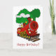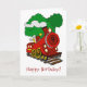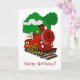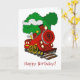 A cute cartoon train with number 9 on the front and smoke coming from the stack and trees in the background.