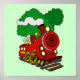 A cute cartoon train with number 9 on the front and smoke coming from the stack and trees in the background.