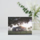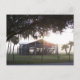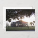 Old ranch building under trees with man statue postcard