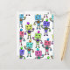 featuring a digital illustration of a multitude of multicoloured old fashioned robots. Each has a light bulb on its head an lots of buttons built into its chest.