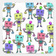 featuring a digital illustration of a multitude of multicoloured old fashioned robots. Each has a light bulb on its head an lots of buttons built into its chest.