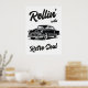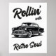 Celebrate the elegance of the past with this striking black-and-white graphic featuring a vintage car and the phrase "Rollin' with Retro Soul." The minimalist color palette highlights the car's intricate details, making it a perfect piece for enthusiasts of classic automobiles and refined design.