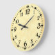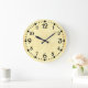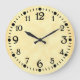 Classic black and white wall clock with a vintage typewriter style. 12, 3, 6, and 9 are slightly larger than the rest. Seconds are marked on outside dial with dots at 5 minute marks on a faux parchment background.