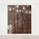 Rustic barn wood and string lights set off this photo prop for your guests photos. Rustic old wood with hanging mason jar lights and fireflies with a mason jar and floral bouquet glowing at the bottom corner creates a country style setting for your guest photos, or as a great backdrop for your wedding guestbook , cake table or wedding reception entrance. 'Happily Ever After' written in hand written calligraphy with the bride and groom's names and wedding date in modern contemporary style text . This is part of a wedding stationery collection with matching wedding accessories. Design created for the BarefootBride™ © by WhimsicalArtwork™