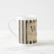 This nautical monogram ceramic mug features a black and beige striped background with a black anchor in the center and world map overlay. Personalize the monogram with your own initials. Designed by world renowned artist Tim Coffey.