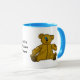 This mug features a teddy bear that has truly been loved. He's patched up from all the hugs, etc. The text on the other side can be changed to say something else, a person's name, etc. I made this mug for Teddy Bear Day. But, teddy bears are now so popular around the world that the date(s) all vary and I didn't put any specific one on this mug. Although I'm showing this on a blue mug, you can buy this design on any color mug, as well as other drinking items offered. Designed by Sheila Cicchi, Brownielocks.com. All Rights Reserved.