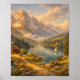 This artwork captures the tranquil beauty of a sunlit alpine valley, where majestic snow-capped peaks rise above a shimmering turquoise lake. A gentle waterfall cascades beside a rustic cabin, while a couple gazes toward a sailboat gliding across the water. Warm golden light bathes the scene, blending soft clouds and lush greenery into a harmonious composition that evokes peace, nostalgia, and timeless natural wonder. Perfect for wall decor that brings calm and elegance to any space.