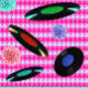 A vibrant and playful digital collage features a repeating geometric pattern of pink and light blue triangles, creating a dynamic background. Scattered across this backdrop are several black vinyl records, each with a different colored label: green, red, blue, and turquoise. The records appear to be floating or suspended in mid-air, adding a sense of whimsy to the composition. Interspersed among the records are fluffy, pom-pom-like flowers in shades of pink, blue, and turquoise, which complement the color scheme of the background. The top and bottom edges of the image are adorned with rows of turquoise flowers, creating a decorative border. The overall style is reminiscent of a retro or vintage aesthetic, with a modern twist. The use of bright, contrasting colors and geometric shapes gives the image a bold and energetic feel. The composition is well-balanced, with the various elements arranged in a visually pleasing manner.
