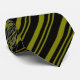 A classic tie design featuring a grouping of thick and thin olive green stripes on a black background.