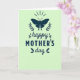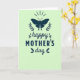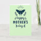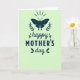 Designed with a soft, pale pistachio-green background, this card centers on a deep teal-blue butterfly silhouette with wings spread wide, suggesting a gentle, affectionate welcome ❤️. On either side of the butterfly, matching sprigs of fine leaves curve upward like laurel branches, creating a balanced frame that feels like a quiet embrace. Above the butterfly, faint radial lines fan out, adding a light, airy lift as if the moment is glowing without being loud. Below the artwork, the text reads “happy MOTHER’S day,” all in the same dark teal-blue for a calm, cohesive look. The word “happy” sits first in a flowing cursive-style lettering with tiny leaf accents tucked around the strokes, like a tender note passed between close hearts 🌼. “MOTHER’S” follows in clear, uppercase lettering that feels steady and supportive, and “day” returns to the flowing cursive style to soften the line. The butterfly is placed at the top center, with the symmetrical foliage flanking it and the lettering stacked neatly underneath.