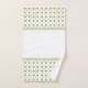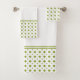 A stylish olive green and white diamond-patterned bathroom towel set.