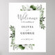 This elegant olive green botanical floral wedding welcome sign can be personalized with your information in modern typography. Designed by Thisisnotme©