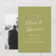 This olive green wedding save the date card blends timeless calligraphy with modern editorial elegance. Designed with refined European estate influence and subtle Island Citrus warmth, it captures Italian countryside romance while feeling fresh and contemporary. The back features your favorite engagement photo for a personal, high-impact reveal. Perfect for the sophisticated bride who loves quiet luxury with a meaningful touch. Pair with olive envelopes or deckled edges for a cohesive suite.