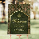 Elegant wedding welcome sign featuring gold accents and beautiful damask pattern with 'Bismillah' in Arabic calligraphy.