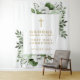 This modern elegant olive green floral first holy communion photo backdrop can be personalized with your information in modern gold typography. Designed by Thisisnotme©