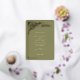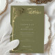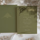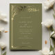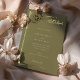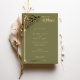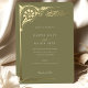 This luxurious Islamic wedding invitation features a sophisticated olive green background, beautifully accented with intricate gold foil details. The front of the card is adorned with a delicate floral motif in gold, paired with elegant script and a traditional Islamic inscription at the top. The refined serif font further enhances the elegance of the invitation, making it perfect for a formal and traditional wedding. The back of the card continues the elegant theme with a subtle olive green design, personalized with the couple's initials. The combination of rich olive tones and shimmering gold foil creates a timeless and regal invitation, ideal for couples seeking a blend of tradition and luxury.