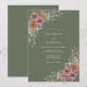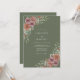 This design features a deep olive green backdrop adorned with lush botanical arrangements. Muted mauve and terracotta dahlias are paired with silvery eucalyptus and delicate white waxflowers. The moody color palette creates an organic and romantic atmosphere perfect for a rustic autumnal or woodland setting.