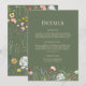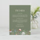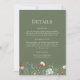 An earthy olive green wedding details card featuring delicate wildflowers arranged in a meadow-style botanical border. Ideal for sharing accommodation information, directions, registry details, and additional events.