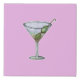 Fancy cocktail with green olives, featured on a soft pastel lavender background.
