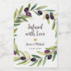 This bottle label for olive oil wedding favors has a frame of watercolor olives branches with green leaves and black olives. The message "Infused with Love" and the names are written in a handwriting script; the rest is written in caps. Above the names there is a small gold heart. The background is white.