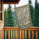 Welcome visitors to your woodsy abode or vacation home with this cute and cheerful flag featuring the phrase "life is better at the cabin in white lettering on an olive green striped background accented with a deer and an arrow. Personalize with your family name and/or year established beneath.