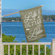 Welcome visitors and guests to your lakeside abode with this cute and cheerful lake house flag featuring the phrase "life is better at the lake" in white lettering on an olive green striped background accented with an anchor and an oar. Personalize with your family name and/or year established beneath.