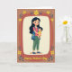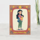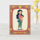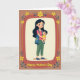 Designed with a tender scene at its center, the card shows a woman with long dark hair holding a smiling baby close, their faces angled toward each other in a quiet, affectionate moment ❤️. She wears a soft pink tunic with a draped blue shawl patterned with small leaf shapes, paired with olive-green trousers. The baby, in a sunny yellow romper, looks outward with bright eyes and a delighted grin, adding a light, friendly energy to the scene 🌼. Around them is a rounded rectangular frame in deep reddish-brown, decorated with clusters of yellow flowers and dark blue leafy branches that curl along the edges. Inside the frame, a creamy beige background keeps the figures clear and gently highlighted. Near the bottom, large yellow text sits centered beneath the figures, standing out against the darker border. Small details like tiny pink buds and golden flower centers dot the border, with dark blue foliage weaving between the blossoms.