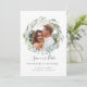 Elegant botanical save the dates feature a favorite engagement photo encircled by a round wreath of olive and leaves in an elegant watercolor palette of grays and green