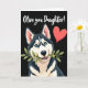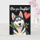 Designed with a striking digital illustration, the card centers on the face of a stylized northern-type dog with sharply defined black-and-white fur and bright blue eyes that feel tender and attentive. The dog holds a slender olive branch in its open mouth, the green leaves and plump olives adding a gentle, affectionate gesture like a quiet offering between close family ❤️. Across the top, the phrase “Olive you Daughter!” appears in white lettering, set clearly above the dog’s ears and easy to read against the dark background. A rich red heart sits near the upper right area, balancing the layout and reinforcing the caring tone without needing extra decoration. The background stays deep black, making the pale fur, green branch, and red heart stand out with strong contrast. Fine linework gives the leaves a light texture, and the dog’s slightly lifted mouth corners suggest a friendly, devoted mood. Small details keep the scene simple but warm, like the steady gaze that feels directed straight at the viewer 🌼. The red heart is a solid shape with smooth edges, floating near the top-right corner against the black field.