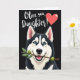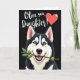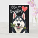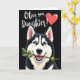 This card shows a cheerful husky-like dog with black-and-white fur filling the lower part of the design, gazing up with bright blue eyes that feel like an affectionate, friendly hello ❤️. Its open-mouthed grin and pink tongue add an easy, lighthearted warmth, like it’s sharing a private joke with its favorite person. The dog gently holds a thin branch between its teeth, and the branch is dotted with small green olives and a few soft leaves, turning the scene into a sweet visual pun. Near the top, the message “Olive you, Daughter!” is placed in white, flowing lettering that stands out strongly against the dark background. A small red heart sits close to the words, adding a romantic note to the family love without needing anything else 🌼. The simple layout keeps your eyes moving from the bright text down to the dog’s face, where the tender expression carries the emotion. The background is solid black, making the blue eyes, green olives, and red heart appear especially crisp and eye-catching.