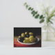 This artist trading card features a tantalizing assortment of delicious olives including Picholine, Nicoise, Kalamata, Green Cerignola and Black Cerignola. They are arranged in a white dish on a colorful woven red, yellow and green mat against a black background for an artistic and mouth watering still life composition.