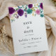This DIY PRINTABLE save the date features rich violet florals and earthy succulent. Use this template to edit the fonts, font color, and background color to match your event needs.