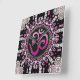 Custom Art Wall Clock : Bright, strong and energizing Geometric pattern in hot pink, black and soft pink sparkly diamond elements with Pink Ombre Sanskrit OM symbol lettering in the centre, for daily meditation reminder at home or office .