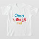 Oma Loves Me T-shirts, cards, stickers, bodysuits bags, and more with colorful red, yellow, and blue text and heart design. These Oma Loves me apparel and gift items will make Oma smile!