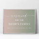 Ombre Leaf Green & Blush Pink Reserved For Bride's Family Wedding Sign - in beautiful handwriting script and your personalized text. A stylish yet simple design with a soft fading ombre gradient background. Just click the edit using design tool link, shown under the text personalization area on the right, and choose your custom color background. This sign poster template makes it fast and easy to create stunning additions to your wedding decor. Signs can be enlarged, there are many sizes to choose from, as well as options for custom framing and matting.