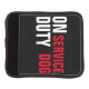 For service dog handlers to display on a leash, harness, or guide handle. Get the message across quickly and clearly. Service dog leash wrap displays the messages "ON DUTY" and "SERVICE DOG" prominently on a black background.