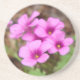 A cluster of violet wood-sorrel's pink flowers, with the clover-like leaves in the background.