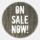 This round sticker sale design features the message "ON SALE NOW!". It also features a faux wood look background. It could be used in a retail store to mark merchandise that has had its price reduced.