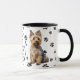 An adorable Australian Terrier Dog sits on two sides of this mug. The text between the two images says "On the 8th day, God created the AUSTRALIAN TERRIER and called it VERY GOOD". The dog images and the white oval banner containing the text fields are placed on a white background with black paw prints.