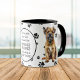 An adorable Border Terrier Dog sits on two sides of this mug. The text between the two images says "On the 8th day, God created the BORDER TERRIER and called it VERY GOOD". The dog images and the white oval banner containing the text fields are placed on a white background with black paw prints.