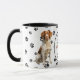 A beautiful Brittany Dog sits on two sides of this mug. The text between the two images says "On the 8th day, God created the BRITTANY DOG and called it VERY GOOD". The dog images and the white oval banner containing the text fields are placed on a white background with black paw prints.