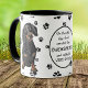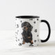 An adorable black and tan Dachshund Dog looks inquisitive on two sides of this mug. The text between the two images says "On the 8th day, God created the DACHSHUND and called it VERY GOOD". The dog images and the white oval banner containing the text fields are placed on a white background with black paw prints. Cute!